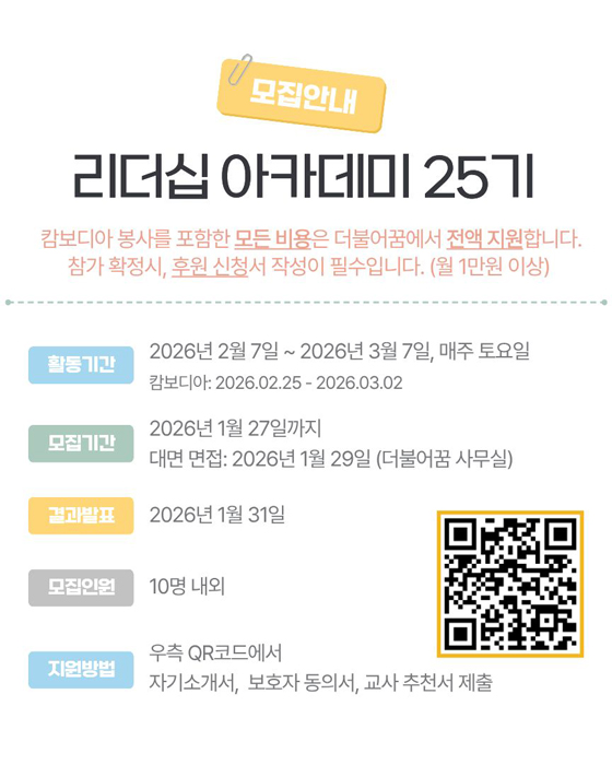 더보기 포토갤러리 리더십 아카데미 22기 2024 구룡마을 연탄배달봉사 인순이 작은음악회 홍천 해밀학교 행복콘서트 캄보디아 봉사캠프 23기 캄보디아 봉사캠프 22기 더보기 공지사항 2025-12-24, 관리자 작성 더불어 꿈은 공부만 잘하는 인재를 넘어 문화적 감성과 이타적 봉사정신을 갖춘 21세기형리더를 기르고자 합니다. 아이들에게 다양한 방법으로 문화를 보고 느끼며 문화적 감성과소양을.. 2025-12-22, 관리자 작성 리더십아카데미 연합으로 구성된 연탄 기부 나눔 봉사기수별로 하나 둘 씩 모이기 시작하였습니다.비가 내리는 날씨에도 마다 않고 모여드는 리더십아카데미 14기,17기,19기,20기.. 2025-12-03, 관리자 작성 6주간의 프로그램 활동을 마치고 수료식을 하였습니다. 저는 하진이와 같은 팀이 되어 로봇을 조립했는데, 저는 부품을 찾고 하진이가 조립하는 방식으로 진행했습니다.. Information 더불어 꿈 후원하기 더불어 꿈에 힘을 주세요. 여러분의 소중한 마음이 모여 자라나는 청소년들의 꿈이 자라납니다. 더불어 꿈 네이버카페 청소년 대상 티켓나눔, 해외캠프, 장학금 등 활발한 활동을 펼치는 더불어 꿈의 네이버카페입니다. 더불어 꿈 유튜브채널 더불어 꿈의 활발한 문화ㆍ교육ㆍ봉사활동을 다양한 영상들로 소개하는 유투브채널입니다. 더불어 꿈 오시는 길 고급문화체험과 봉사활동 연계 등을 통해 청소년 육성을 하는 더불어 꿈에 오시는 길입니다.